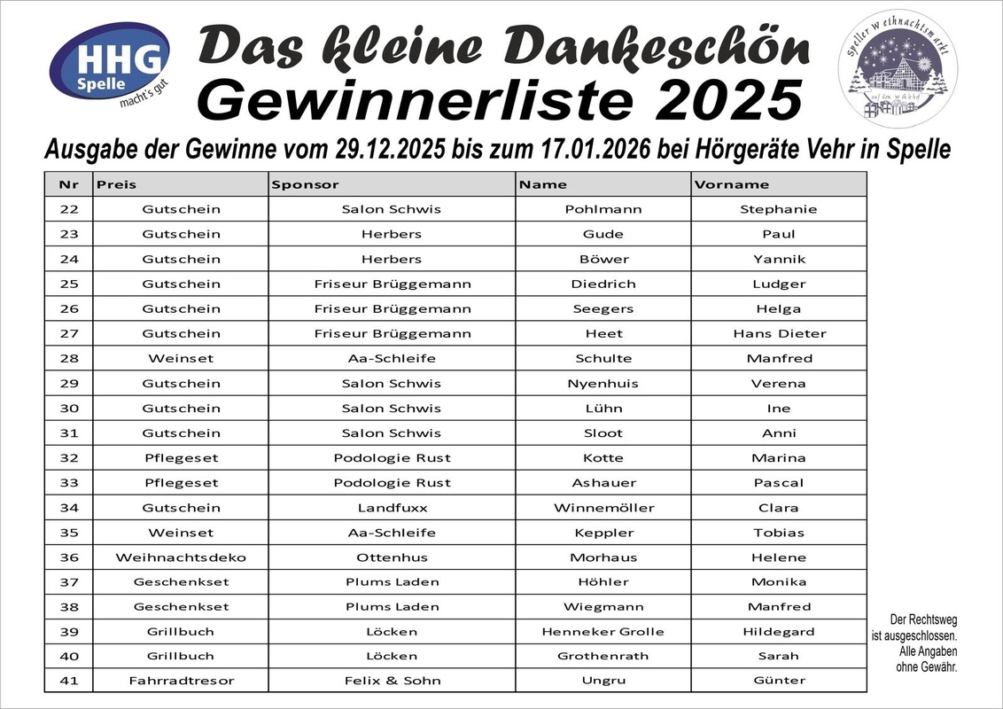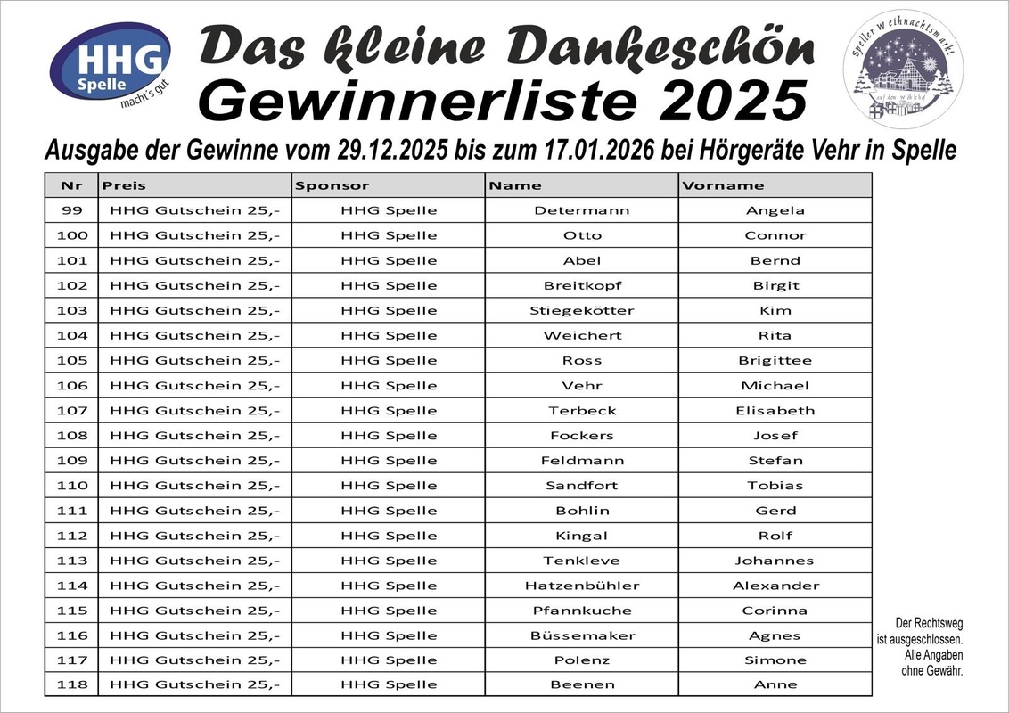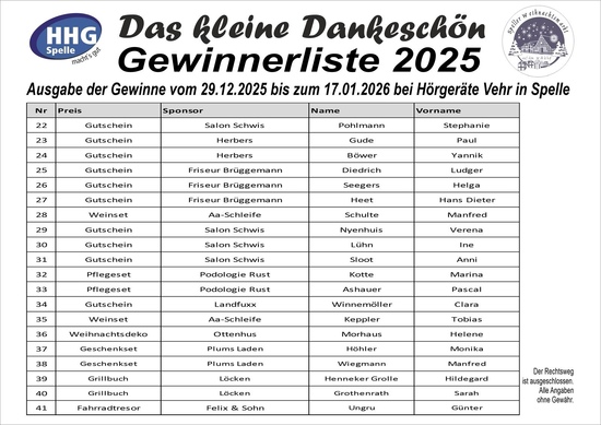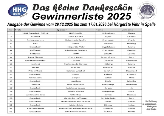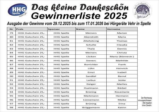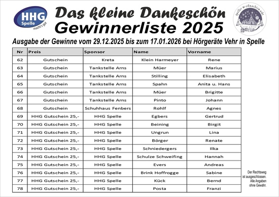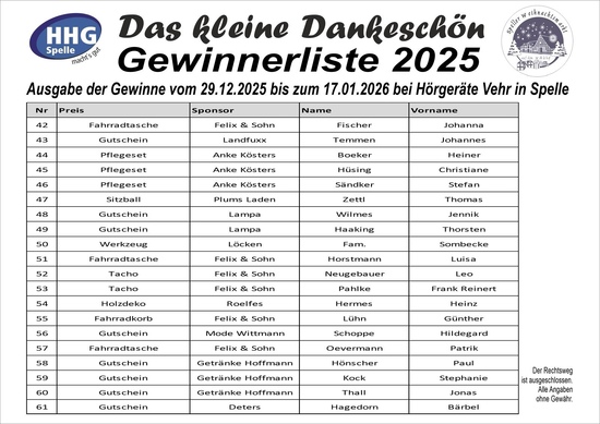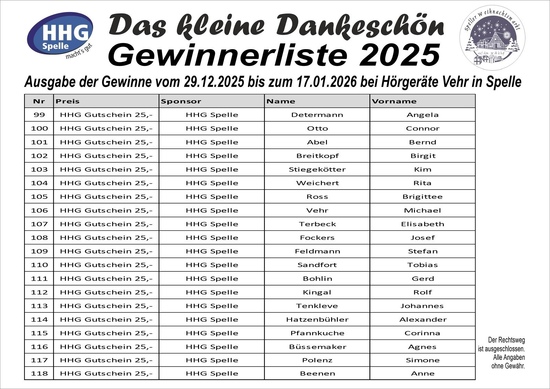 Die Preise können bei Hörgeräte Vehr in Spelle zu den Öffnungszeiten im Zeitraum 29.12.25 – 17.01.26 abgeholt werden!